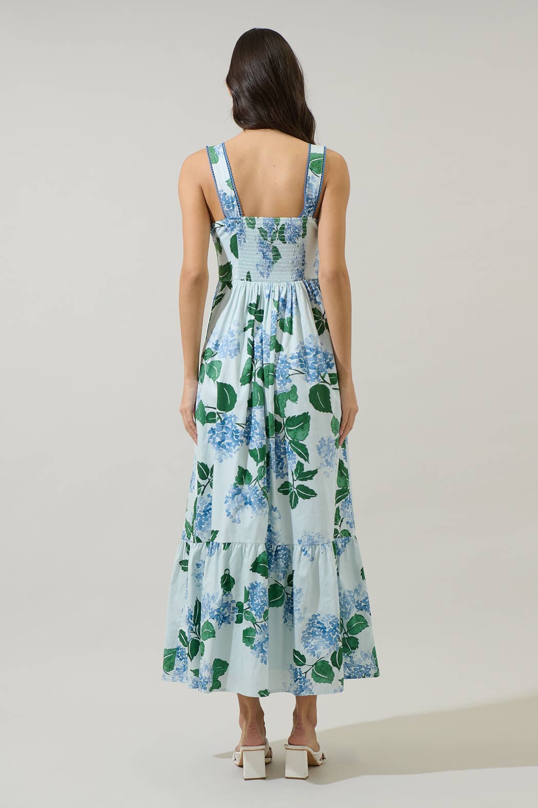 A light blue maxi dress with a square neckline, thick straps, a gathered waist, and an all over print of large blue hydrangeas and green foliage. Wear it with strappy heels for a cute look. - Square neck - Floral - Sleeveless - Pockets