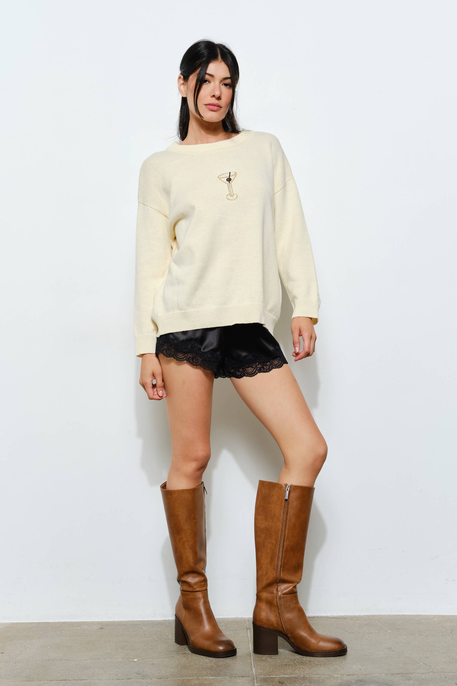 Shake up your style with the Sora Martini Bead Sweater! This playful knit is designed for those who love to stand out, featuring eye-catching martini bead embroidery that adds a fun, whimsical twist. The oversized fit and long sleeves make it perfect for cozy days or making a statement on a night out. Crafted from a soft, stretchy blend, this sweater is as comfortable as it is bold-just pair with your favorite jeans or skirt for instant, effortless chic. - Knit sweater for cozy, everyday comfort - Martini bead embroidery for a playful, statement detail - Long sleeves for versatile, all-season wear - Oversized fit for a relaxed, on-trend silhouette Model is 5'8" and wearing a size small. Fabric: 65% Polyester, 30% Cotton, 5% Spandex