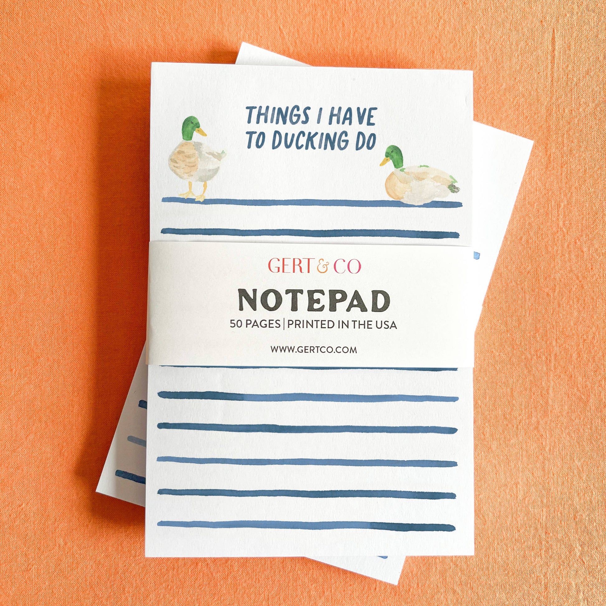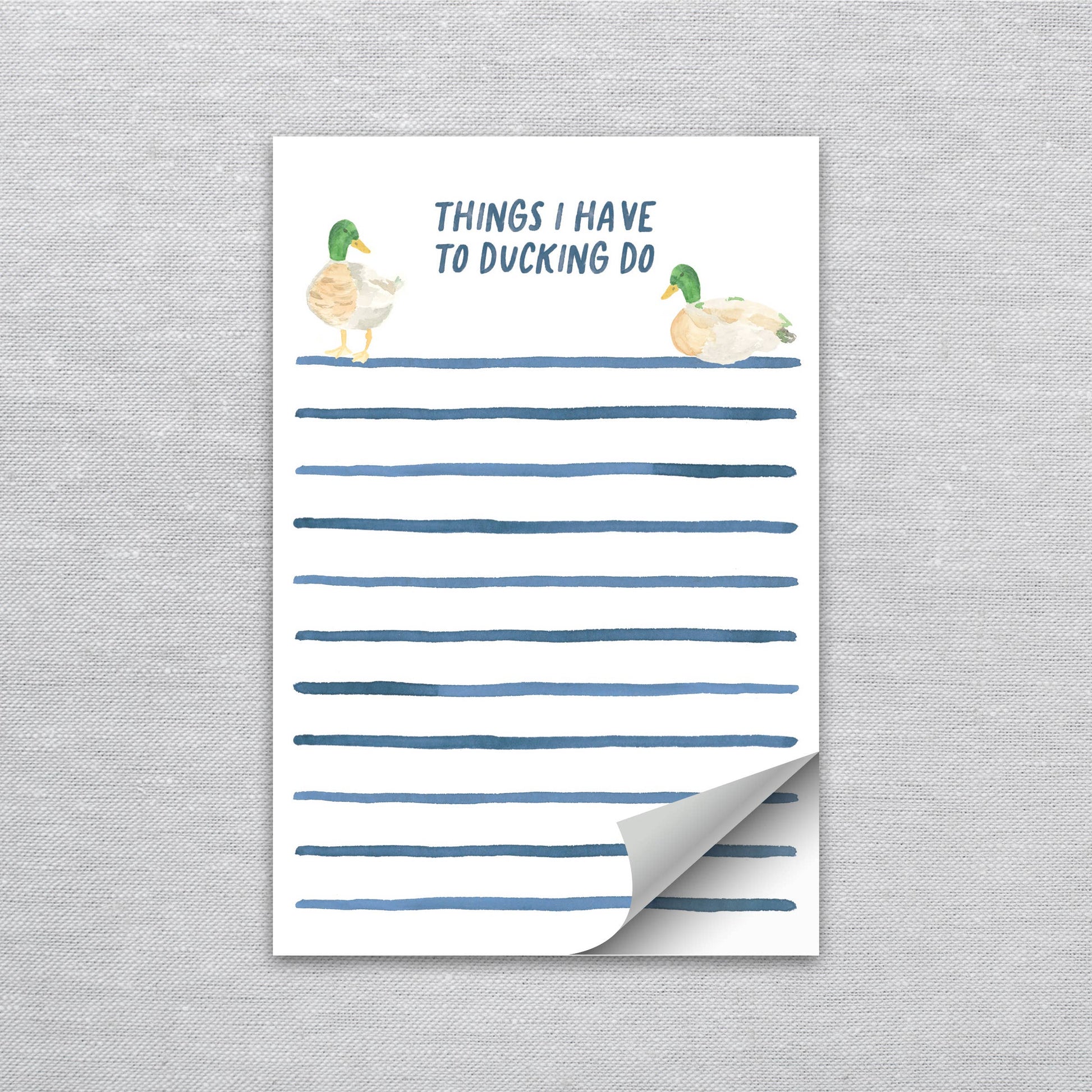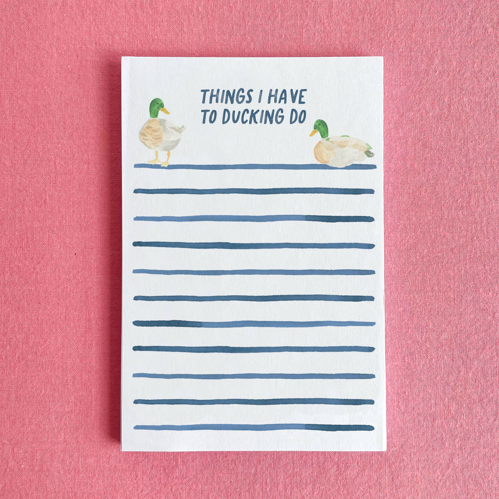 A notepad with a little attitude for your busiest days. This 4"x6" pad features an original watercolor painting of ducks with coordinating watercolor stripes and the playful phrase “things I have to ducking do.” Perfect for jotting down daily tasks, grocery lists, or reminders—with a smile.
