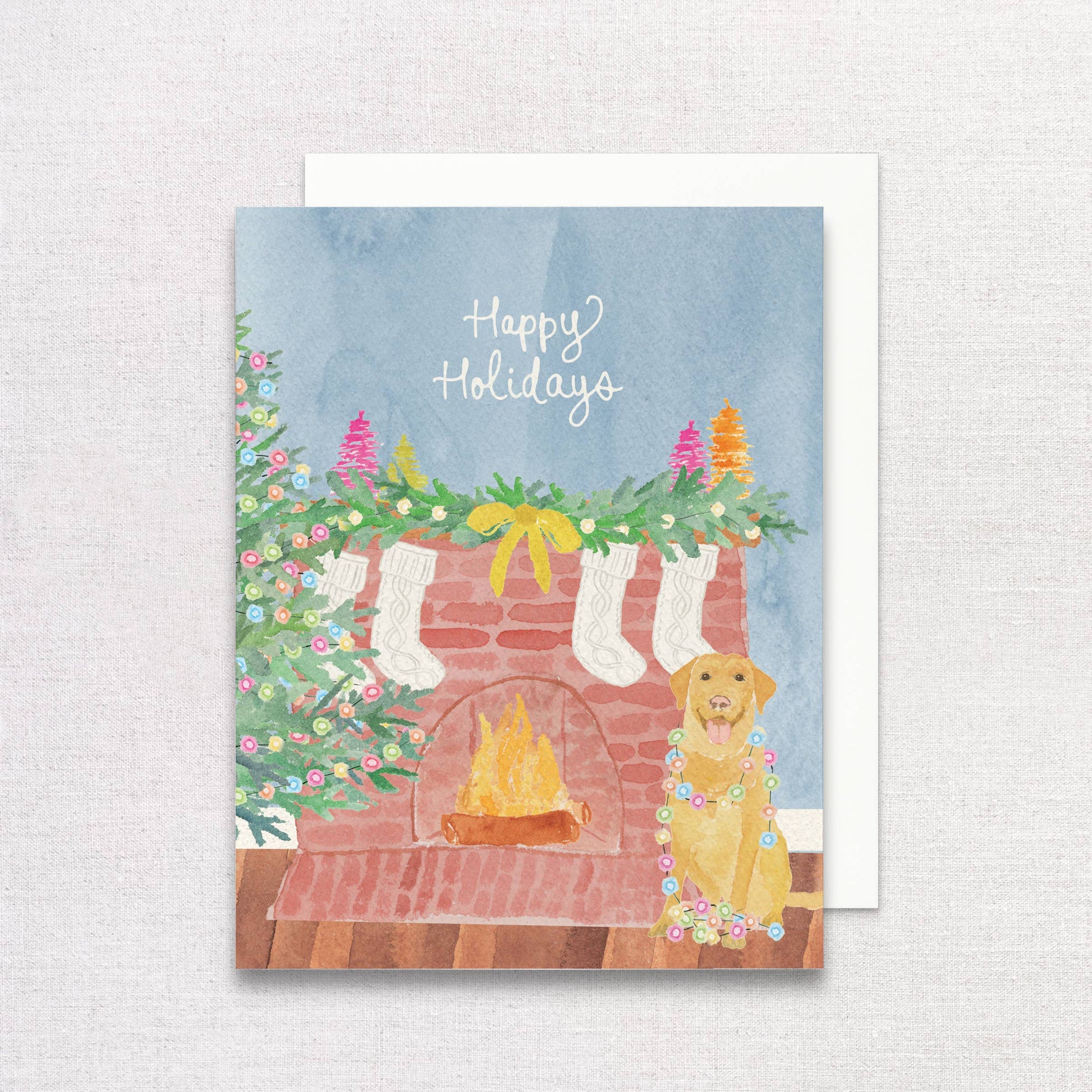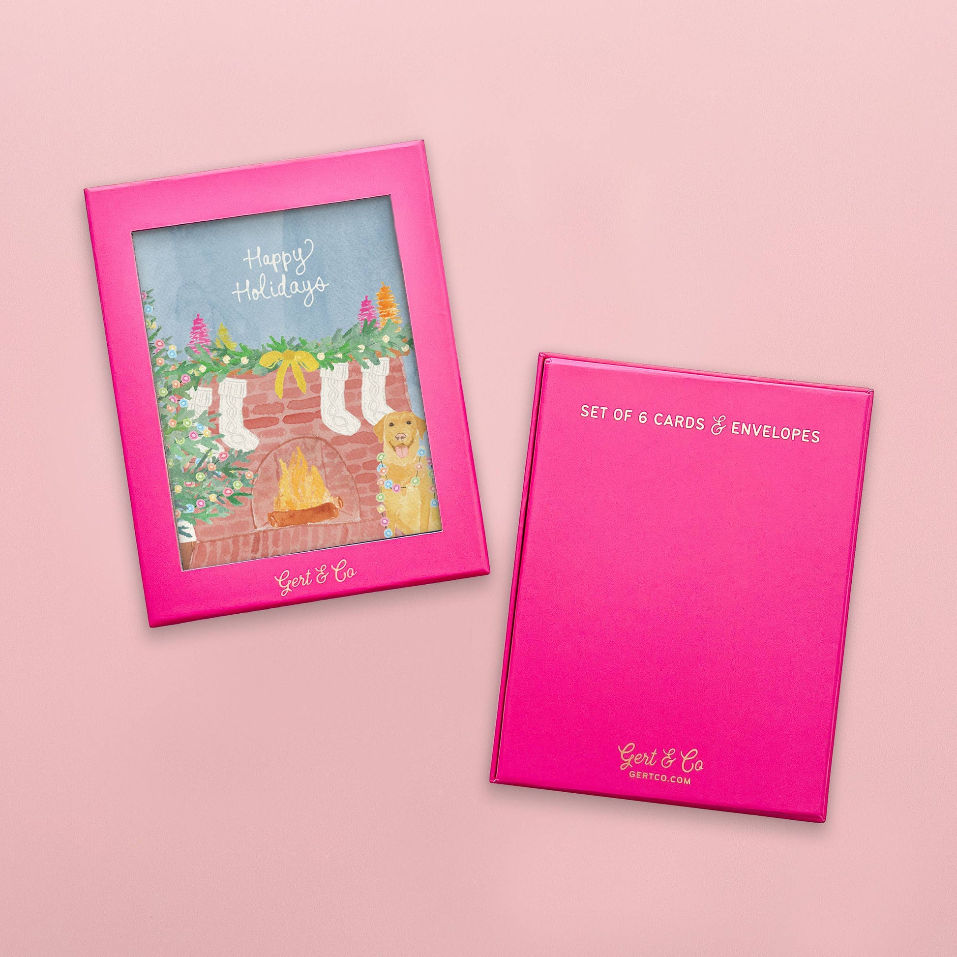 Send cozy vibes and canine cheer with this boxed set of 6 whimsical holiday cards featuring a hand-painted fireplace scene, a colorful Christmas tree, and a yellow lab wrapped in Christmas lights. Packaged in a bright pink box with gold foil details, it’s a playful way to celebrate the season—festive, warm, and just the right amount of cute.